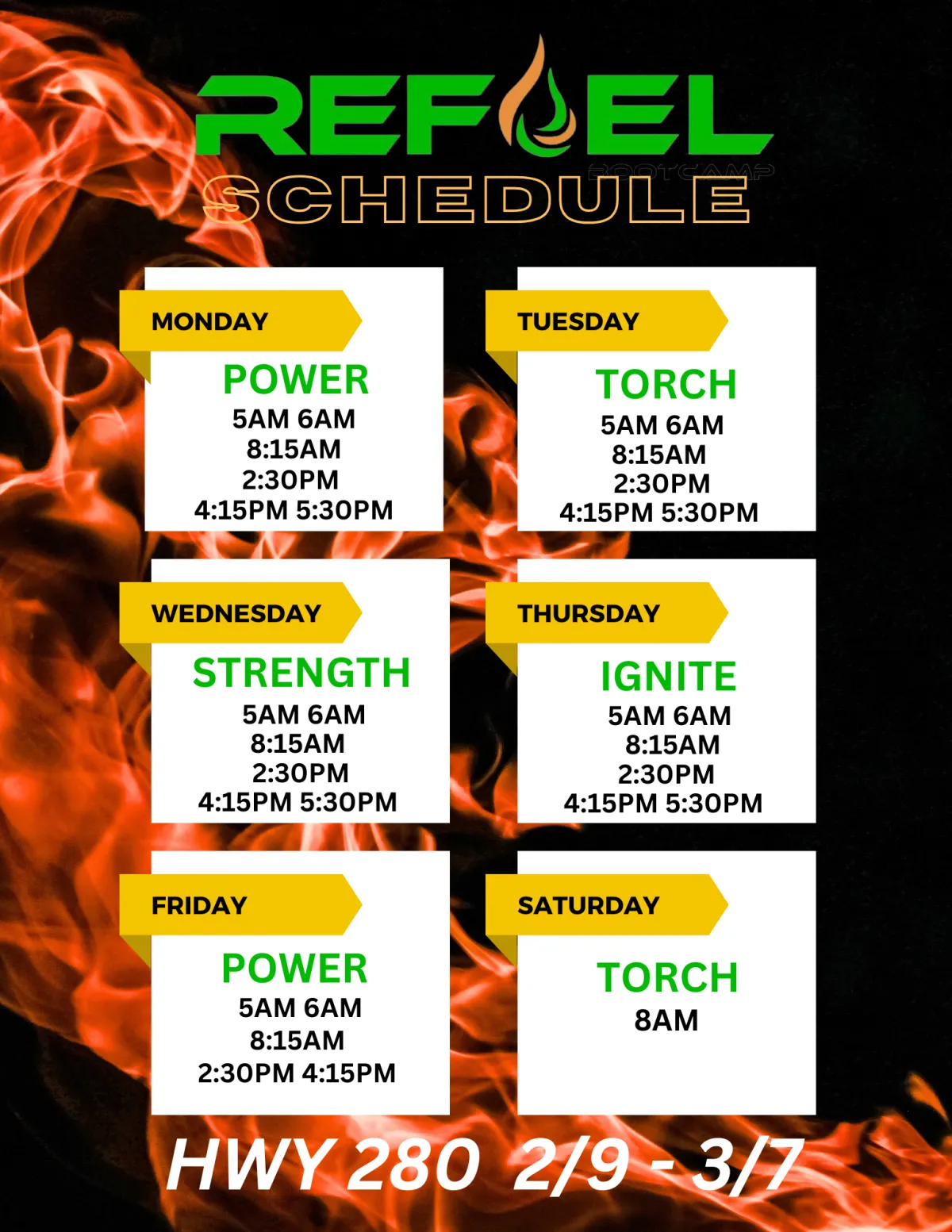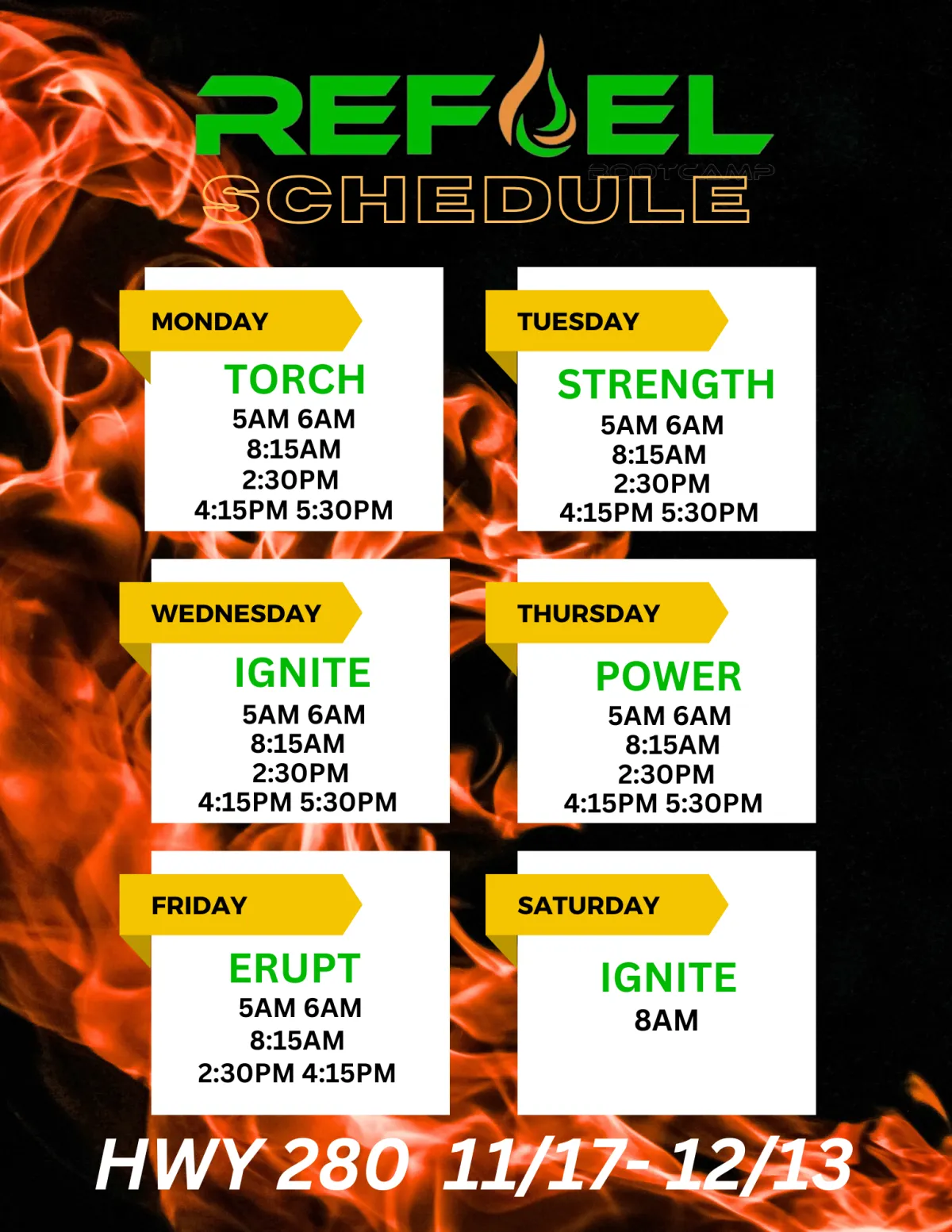 REFUEL Bootcamp, is a dynamic community for all fitness levels with the shared goal of self-improvement. Our 50 minute bootcamp classes are designed to maximize strength and endurance while sculpting your body. All classes are trainer led for proper form, and visual TV's for correct exercise movements.